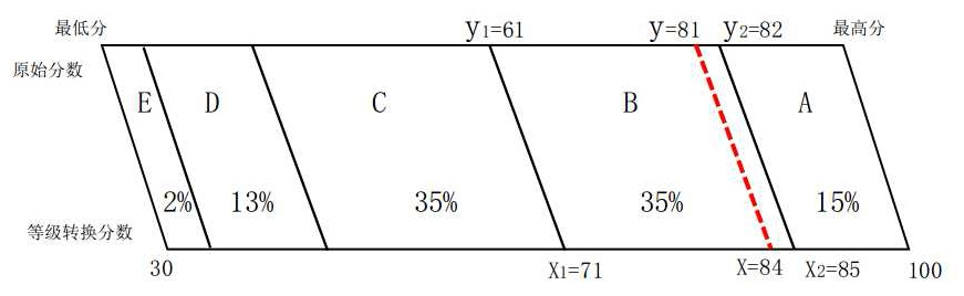 先按原始分?jǐn)?shù)劃定等級,再進(jìn)行等級賦分。按照每門科目考生的原始分?jǐn)?shù)從高到低劃定為A、B、C、D、E五個(gè)等級,各等級人數(shù)所占比例分別為15%、35%、35%、13%和2%,將考生的原始分?jǐn)?shù)轉(zhuǎn)換成等級。轉(zhuǎn)換基數(shù)為實(shí)際參加該科目考試并取得有效成績的人數(shù)。成績轉(zhuǎn)換時(shí)以30分作為賦分起點(diǎn),滿分為100分。將A至E五個(gè)等級內(nèi)的考生原始分?jǐn)?shù),依照等比例轉(zhuǎn)換方法,分別對應(yīng)轉(zhuǎn)換到100~86、85~71、70~56、55~41和40~30五個(gè)分?jǐn)?shù)區(qū)間,得到考生的等級轉(zhuǎn)換分?jǐn)?shù)。等級轉(zhuǎn)換分?jǐn)?shù)計(jì)算結(jié)果按“四舍五入”進(jìn)行處理,以整數(shù)呈現(xiàn)。等級轉(zhuǎn)換分?jǐn)?shù)一分一檔,與原始分?jǐn)?shù)排序保持不變。