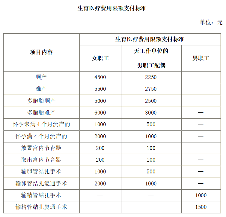 (一)參保職工生育或實施計劃生育手術的醫療費用實行限額保障。參保男職工的配偶無工作單位的,生育或者實施計劃生育手術所發生的醫療費用,按照參保女職工生育醫療費用限額支付標準的50%由生育保險支付。實際發生的符合生育保險待遇支付有關規定的醫療費用低于生育醫療費用限額支付標準的,按實際發生的醫療費用支付。
