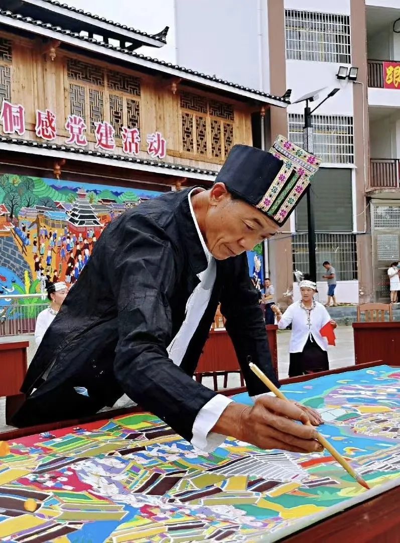 楊玉潔,廣西美術(shù)家協(xié)會會員,自治區(qū)級三江農(nóng)民畫生產(chǎn)性保護示范戶,三江農(nóng)民畫市級傳承人,侗天宮非遺研學(xué)基地指導(dǎo)老師。
