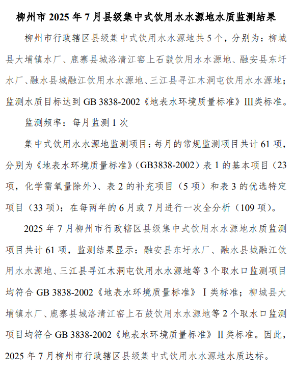 2025年7月份柳州市縣級飲用水質(zhì)量報告
